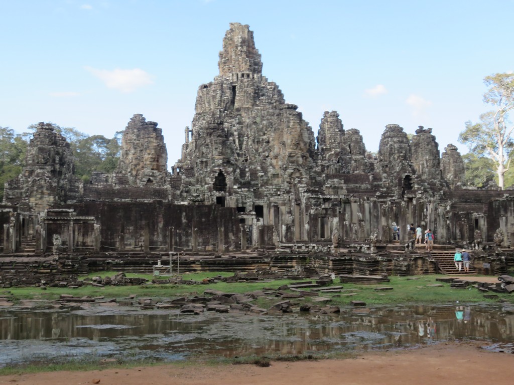 Sortant affamés du Preah Khan, nous en profitons pour nous restaurer dans un petit restaurant extérieur protégé du soleil par des bâches et aéré par un ventilateur que nous installe la gérante. Il fait évidemment chaud, mais je m’y sens tellement bien qu’après le repas et sans préméditation je m’accorde une micro-sieste. Nous continuons ensuite vers le complexe de temples d’Angkor Thom, qui renferme entre autre le Bayon qui est l’autre temple star de cette zone avec Angkor Wat. Suite à cette visite, nous laissons Claire, Emeric et Maud rentrer à l’hôtel, et nous enchainons sur un dernier petit temple qui a la particularité de se trouver sur une belle colline. Nous arrivons suffisamment tôt pour y assister au coucher du soleil sur la jungle, les rizières et certains temples qui dépassent de la cime des arbres. Même si nous ne sommes pas les seuls, le moment est magique.
