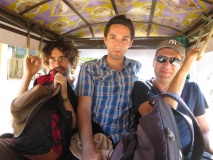La nuit a été bonne, une fois encore, et a permis de reposer nos fessiers endoloris par la journée de vélo d’hier. Nous nous retrouvons donc tous les 5 au petit déjeuner dès potron-minet. Celui-ci est apprécié et enjoué, d’autant plus que, contrairement à la veille, il y a vraiment la possibilité de choisir entre plusieurs menus ! Bref tout le monde se retrouve repu vers 8h30 autour de notre chauffeur et de son tuk-tuk pour commencer notre nouvelle journée de visite, car, oui, courageux mais pas téméraires, nous laissons nos vélos au garage aujourd’hui. Par contre, je ne pense pas que Benjamin, dans sa précipitation à pondre son compte rendu de journée d’hier, vous ait expliqué à quoi ressemblait un Tuk-tuk. Pour ceux qui connaissent Tintin et notamment le Lotus Bleu, cela ressemble un peu au rickshaw dans lequel évoluait notre héros. Néanmoins, dans notre cas, au lieu d’être tiré par un humain, celui-ci a été adapté pour pouvoir être tracté par la plupart des engins motorisés à 2 roues : motos, mobylettes, scooters, peut-être même vélo… Du coup nous étions impatients de savoir si nous allions avoir un chauffeur équipé en Harley… Bon, ce ne fut pas le cas…