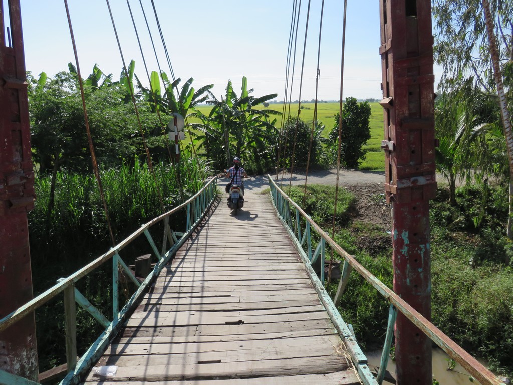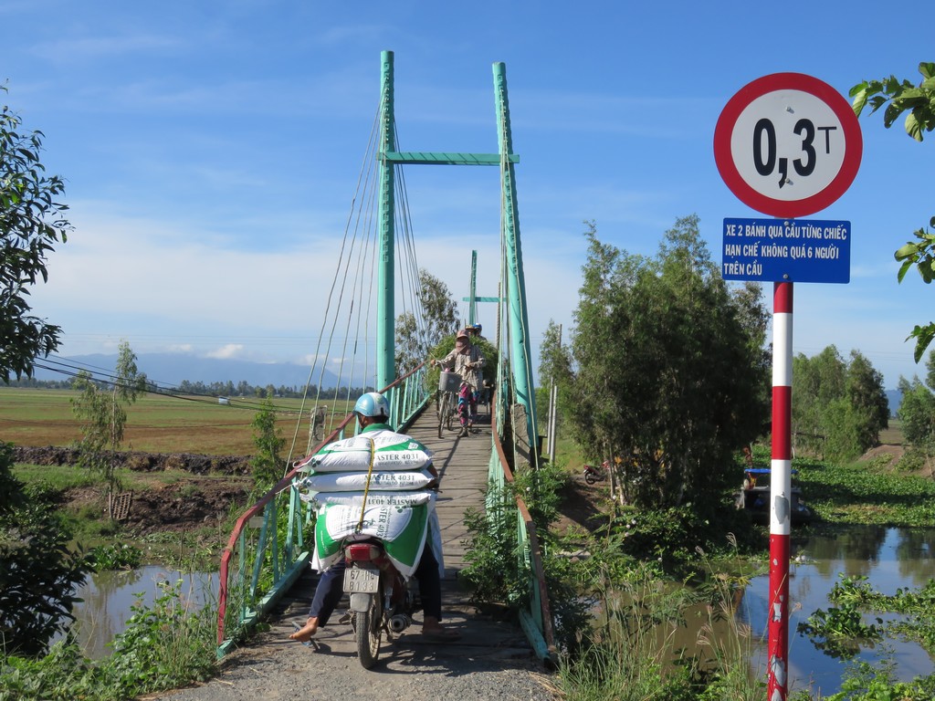 Aujourd’hui nous passons la journée à Chau Doc au Vietnam, juste au niveau de la frontière avec le Cambodge, en compagnie de San. Après le cours de cuisine de la veille, elle va nous faire visiter les environs. A 8h, elle nous attend déjà à l’accueil de la guesthouse. Nous montons sur la moto qu’elle nous a prêté la veille et la suivons en dehors de la ville. Ce qui nous avait déjà sauté aux yeux hier est encore plus flagrant ce matin : les infrastructures routières sont un peu plus avancées qu’au Cambodge : les routes sont plutôt bonnes, il y a des barrières de sécurité et même une ligne au milieu pour séparer chaque côté ! Et les conducteurs, presque uniquement des 2 roues, semblent respecter un peu plus le code de la route. En plus, c’est beaucoup plus propre et il n’y a pas autant de bordel sur le trottoir. Par contre, ici comme au Cambodge, dès qu’il y a un mariage, ils ont la bonne idée d’installer de grandes tonnelles directement sur la route et cela bloque un peu la circulation. On passe régulièrement à côté d’un mariage avec la musique vietnamienne à fond.