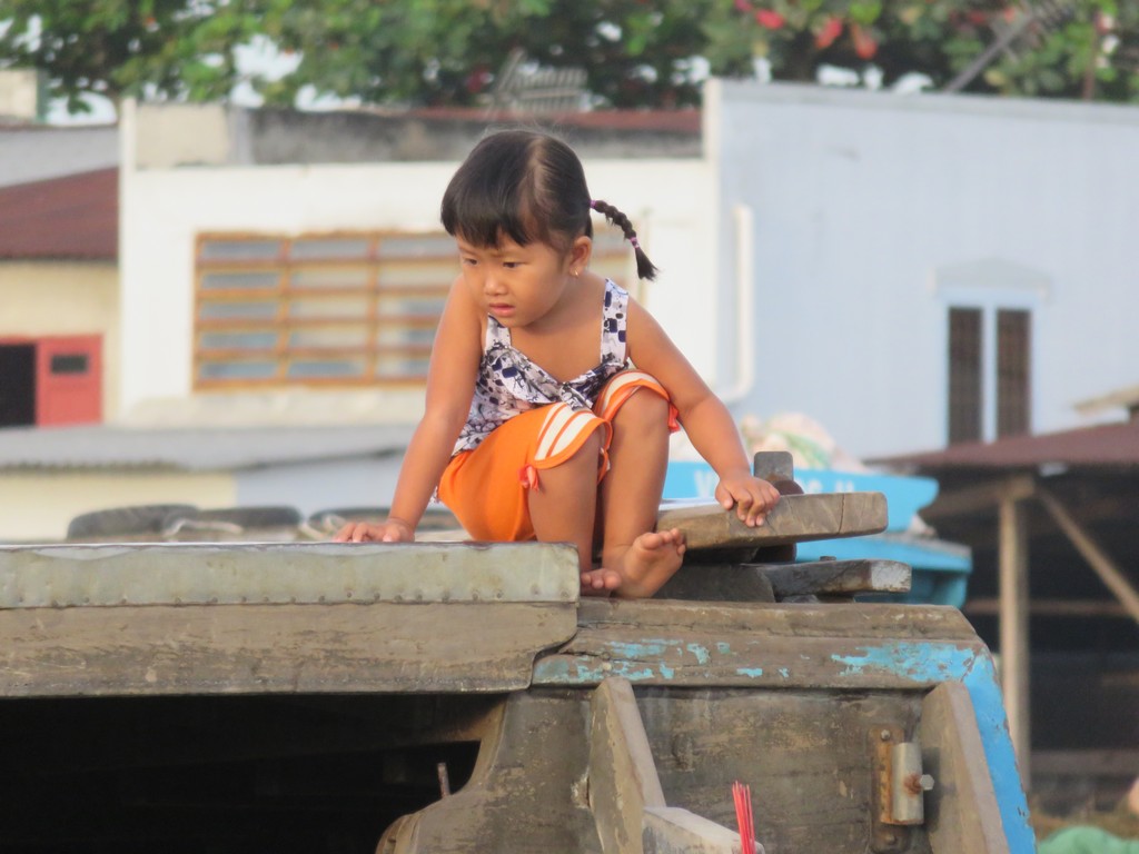 Déjà le réveil de Benjamin nous déchire joyeusement les tympans et nous sortons de notre torpeur au ralenti nous demandant encore où nous sommes. Il faut dire qu’il est 5h du matin, que nous sommes enfermés dans une moustiquaire sur un lit qui est pratiquement dehors. Heureusement, les grands amis de Benjamin, symbole de notre fière nation, les nombreux coqs des environs, se répondent et s’égosillent à qui mieux-mieux. Benjamin les remercie d’un sonore et sympathique « Vos gueules ! » et se cache la tête sous l’oreiller. Le départ de notre embarcation étant à 5h30, nous n’avons pas le temps de prendre un petit jus : il nous faut embarquer avec Lily qui nous servira de guide pour la visite de ce matin. Pour finir de mettre Benjamin de bonne humeur, on lui demande rapidement de changer de place pour équilibrer l’embarcation. Néanmoins les premières couleurs de l’aube finissent par nous réconcilier avec la matinée et nous découvrons après une trentaine minute de navigation un grand nombre de jonques en stationnement en plein milieu du Mékong : nous venons d’arriver au marché flottant de Cai Rang. Se faufiler entre tous ces bateaux est très surprenant et nécessite une grande dextérité de notre pilote, qui nous a quand même fait enfiler des gilets de sauvetage… Lily nous explique comment repérer ce que vend tel ou tel bateau : des « mats de cocagne » hérissent chacun des bateaux laissant pendre ce que celui-ci propose. On voit ainsi suspendu de nombreux fruits : bananes, watermelons, mais aussi des patates douces et plein d’autres choses. Lily nous explique aussi que certains bateaux mettant plusieurs jours pour arriver sur zone, certains camouflent de véritables et confortables habitations. Après avoir senti l’atmosphère de marché flottant, notre pilote accoste et Lily nous emmène à terre dans le marché local, où certains des produits proposés arrivent directement des bateaux stationnés juste en face. Elle nous fait ainsi découvrir et déguster certains fruits qu’on ne trouve qu’au Vietnam, mais aussi des pâtisseries et des dumplings au porc (ce qui à 7h du matin peut sembler un peu rude). Benjamin qui pouvait devenir le saint patron des grenouilles ignore totalement un énorme batracien qui essayait de se faire la malle en glissant discrètement d’un présentoir où il était proposé à la vente. Tant pis, il ne restera que le saint patron des agences de tourisme.