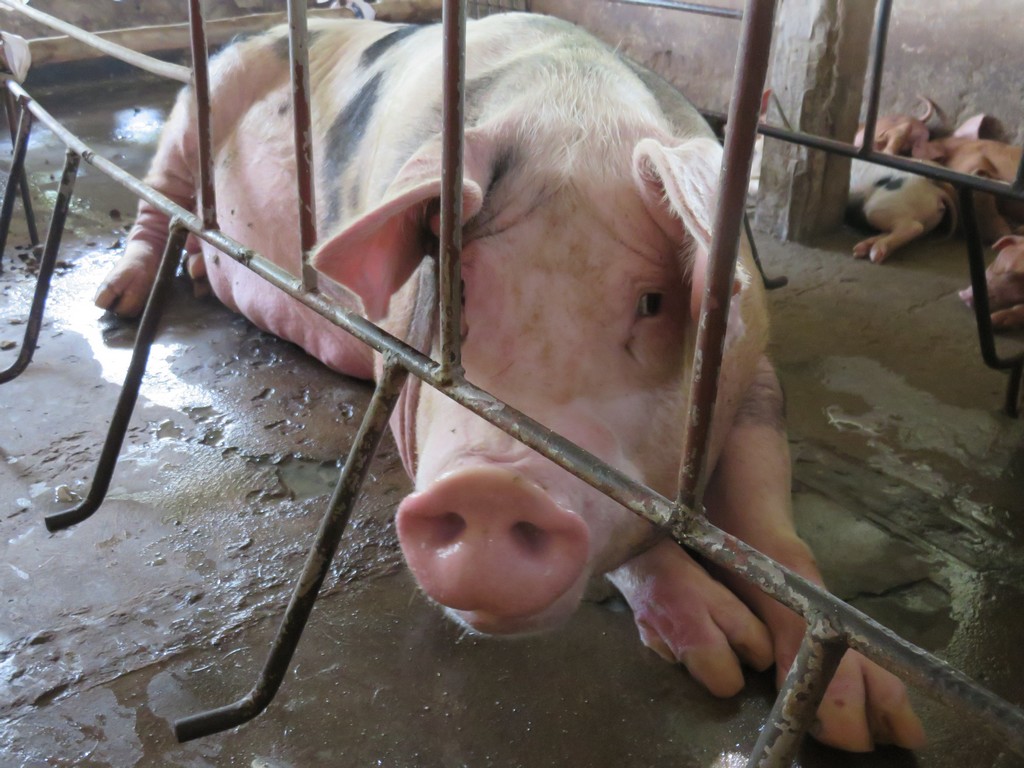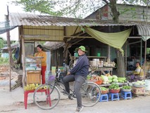 La visite se terminant, nous réembarquons et rentrons tranquillement à notre hôtel, en sympathisant avec Lily et le pilote qui nous apprend là aussi quelques rudiments de vietnamien tout en dégustant les fruits restants. Une fois arrivés, nous absorbons un léger petit déjeuner et ré-enfourchons des vélos : Lily nous emmène faire un tour du village voisin. Les pistes cyclables sont géniales, longent les petits bras du Mékong qu’enjambent quelques ponts bétonnés, elles sont aussi abritées par de nombre palmiers, il faut dire qu’elles sont également utilisées par les mobylettes locales et desservent de nombreuses habitations. Nous enchainons ainsi une visite chez le maréchal ferrant qui fait de nombreux type de lames, le producteur d’alcool de riz qui élève également des cochons dont certains sont énormes, une école où les enfants nous saluent d’un « Hello ». Nous allons ensuite à la pagode où Lily nous présente les différentes divinités, nous explique aussi le rôle social des moines et moniales qui sont dans cette pagode. Ainsi, certains bébés qui ont à peine 2 jours, sont anonymement déposés par leurs mamans qui veulent éviter la honte d’une naissance hors mariage. Lily nous explique ainsi le poids des coutumes encore profondément ancrées dans le Vietnam profond. Une collation de fruits et de boissons fraîches nous est alors servie dans la pagode. Nous finissons le tour à vélo en passant par l’usine de riz et le docteur local qui regroupe une impressionnante collection d’herbes médicinales et nous rentrons alors à l’hôtel pour nous reposer, il commence à faire très chaud.