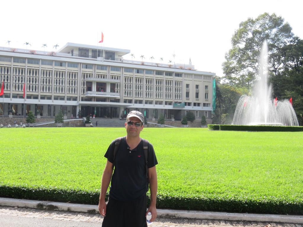 L’après-midi sera un peu moins mouvementée, mais tout aussi physique car nous allons découvrir Ho Chi Minh à pieds cette fois ci, en commençant par le palais de l’Indépendance que nous visitons du sommet (qui abrite un petit helipad) au bunker. Puis nous continuons pour arriver au Cho Ben Thran, qui est encore un grand marché et où nous nous faisons accoster régulièrement pour des T-shirts et autres babioles. Nous sortons rapidement et abordons ce qui devait être une grande épreuve : le traversé de route. Et finalement, en avançant régulièrement, sans être trop téméraire, mais sans hésiter non plus, le défi se surmonte. Puis enchainons vers l’hôtel de ville qui s’épanouit au bout d’une belle grande place où trône une statue de Ho Chi Minh. L’après-midi se finira en petite randonnée le long de rues au trafic plus ou moins dense en y intercalant des pauses boissons et photos. Finalement nous retrouvons Florence, qui nous propose de troquer le short pour un pantalon, ce soir elle nous emmène faire un petit Roof-top surprise. Et, pour le coup, le Wahou-factor fonctionne à 100% : une fois délivrés de l’ascenseur, nous devons descendre quelques marches permettant d’accéder à la terrasse et la vue, notamment sur la Bitexco Tower, pile en face, nous émerveille. De plus, les hauts parleurs délivrent un fond sonore relativement rythmé qui nous plait bien, et la Bitexco Tower semble s’éclairer presqu’au même rythme délivrant ainsi un show inattendu et privilégié. Nous devisons tranquillement en sirotant nos boissons et comme avec Maud pour Phnom Penh, Florence nous explique comment elle s’est habituée à la vie à Ho Chi Minh après celle de New York. C’est aussi l’occasion pour Benjamin et Florence de se remémorer quelques souvenirs.