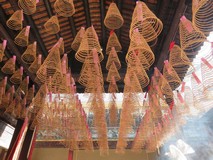 Nous nous rendons d’abord vers la Poste centrale et la Cathédrale qui sont au cœur du District 1 de HCMC. La poste est magnifique, d’un style un peu hispanisant, et on ressent encore à l’intérieur les années coloniales : il y a encore de belles et vieilles cartes aux murs, une personne est disponible pour faire des traductions en anglais, français ou vietnamien, il y trône néanmoins un grand portrait d’Ho Chi Minh au centre du hall. La cathédrale qui se trouve presque en face est composée de briques roses qui auraient été directement importées de Toulouse. D’extérieur elle nous semble assez mignonne avec ces 2 clochers et sa position centrale, d’ailleurs quelques couples se font photographier devant et il y a même des célébrations de diplôme qui se déroulent au moment de notre passage, profitant du cadre de cette cathédrale et de la poste. Néanmoins l’intérieur ne nous paraît pas proposer beaucoup d’intérêt. Nous réenfourchons nos motos pour alors rejoindre un Wet Market. Les marchés sont un peu plus propres qu’au Cambodge et nos accompagnateurs nous proposent là aussi de nombreux fruits savoureux dont un que nous avions déjà particulièrement aimé mais dont nous ne rappelions plus du nom : le Sapodilla. Le tour se poursuit ensuite dans une jolie pagode où nous découvrons une nouvelle manière de présenter ses prières : le serpentin d’encens. Cela prend une petite semaine pour que le bâton, qui a une forme de serpentin et qui est accroché - une fois allumé - au plafond de la pagode s’éteigne et que le vœu qui est accroché à la base ne soit censé se réaliser. Après une intéressante discussion sur le calendrier lunaire utilisé au Vietnam, les différentes années (nous sommes de l’année du Singe par exemple) et les différents caractères qui viennent avec chaque animal, nous reprenons une dernière fois la moto pour déguster un plat typiquement vietnamien : le pho. Nous nous délectons ainsi de ce plat national constitué d’une grande soupe avec des noodles, des légumes et de la viande que nous pouvons ensuite tremper dans une sauce additionnelle à pimenter à sa convenance. Ce repas se déroule ainsi joyeusement et c’est relativement triste que nous reprendrons enfin les motos pour revenir chez Florence en début d’après-midi, repus et riches des différentes rencontres et échanges que nous avons pu vivre ce matin.