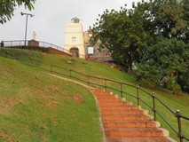Nous prenons ensuite la direction de Port Dickson au sud que nous rejoignons 1h plus tard. Nous avons rapidement quitté l’autoroute pour suivre la route de l’aéroport puis la route côtière. Les plantations de palmiers se succèdent de chaque côté. Port Dickson présente peu d’intérêt touristique, nous nous y arrêtons juste pour manger au Mc Do local (j’ai testé le burger samourai) qui se trouve à quelques mètres de l’océan indien. Après le repas, nous reprenons direction Cape Rachado qui se trouve un peu plus au sud. Nous y faisons une balade rapide pour rejoindre un phare perché en haut et au bout du cap. La montée est raide mais le phare et la vue autour de celui-ci valent le coup. La chaleur est toujours très lourde mais cela reste supportable à l’ombre.