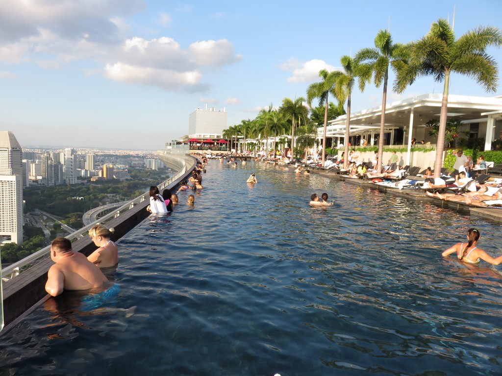 Pour terminer en beauté notre escale à Singapour, nous avons cassé un peu plus la tirelire pour passer une nuit dans l’hôtel le plus connu de Singapour, le Marina Bay Sands. Il s’agit d’un énorme hôtel composé de 3 tours de 55 étages surmontées d’une terrasse géante avec une piscine à débordements de 150 mètres de long. L’enregistrement étant à partir de 15h, nous y étions à 14h45 et comme on a dû plaire à la réceptionniste elle nous a surclassés dans une chambre au 31ème étage avec vue sur la ville (au lieu de vue sur les jardins). Et le résultat était à la hauteur de nos attentes : une chambre énorme (la douche à elle-même faisait la moitié de la taille de notre chambre de la veille…), une vue incroyable et on a bien profité de l’accès inclus à la piscine sur le toit tout le reste de l’après-midi.