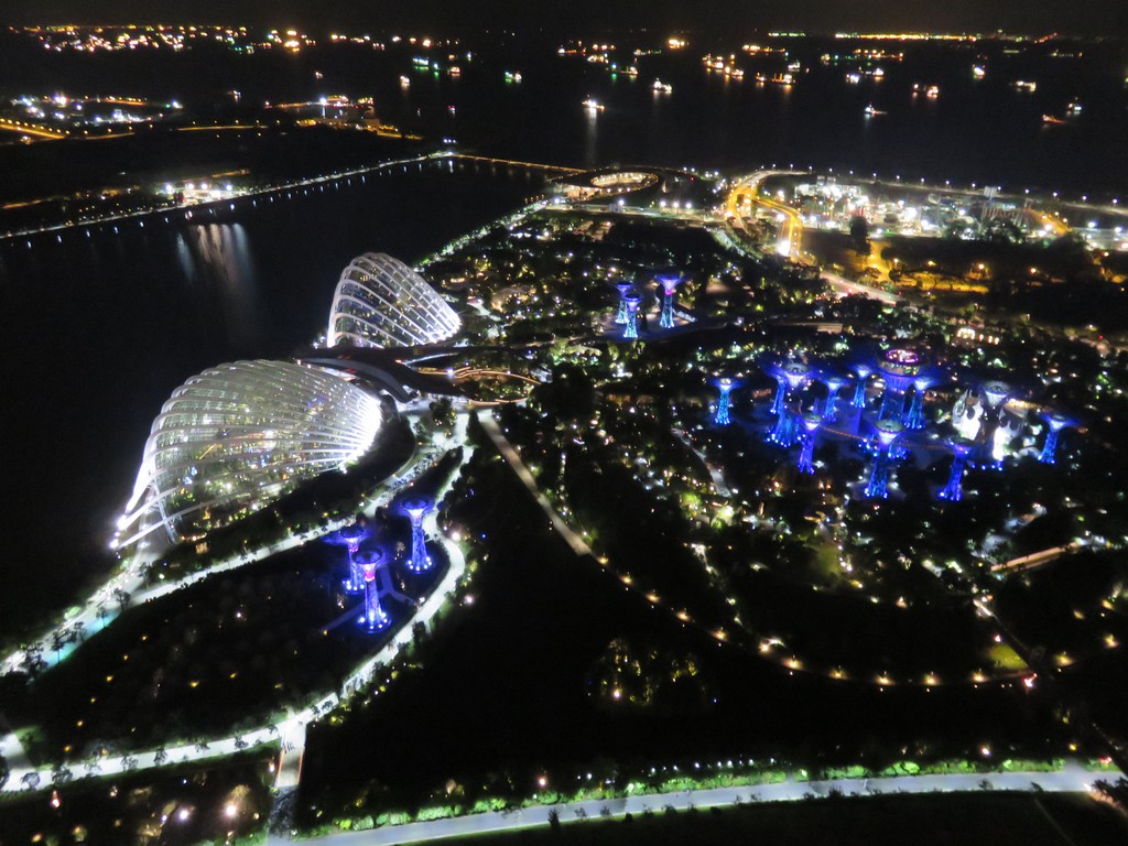 En fin d’après-midi, nous sommes redescendus de notre bulle pour aller visiter le Gardens by the Bay. Il s’agit d’un grand parc se trouvant juste à côté de l’hôtel où ont été construits 2 serres géantes ainsi que des super-arbres, des arbres métalliques de 25 à 50 mètres de hauts sur lesquels pousse de la végétation. Nous y étions juste à temps pour le coucher du soleil et les couleurs étaient splendides, plus encore quand les arbres se sont illuminés. Nous avons terminé la soirée en enchainant de très bons moments : un repas très animé et délicieux au hawker du parc (centre en plein air proposant plein de sortes de nourritures), un show musical et en lumières aux super-arbres, un autre show musical sur la baie devant l’hôtel (avec des vidéos projetées sur l’eau et des jeux de laser très sympas), un retour à la piscine au 57ème étage jusqu’à 23h et enfin une sortie au club de l’hôtel toujours sur le toit. Bref on a profité au maximum de cette journée et le retour à la réalité (et au Cambodge) va être dur demain…
